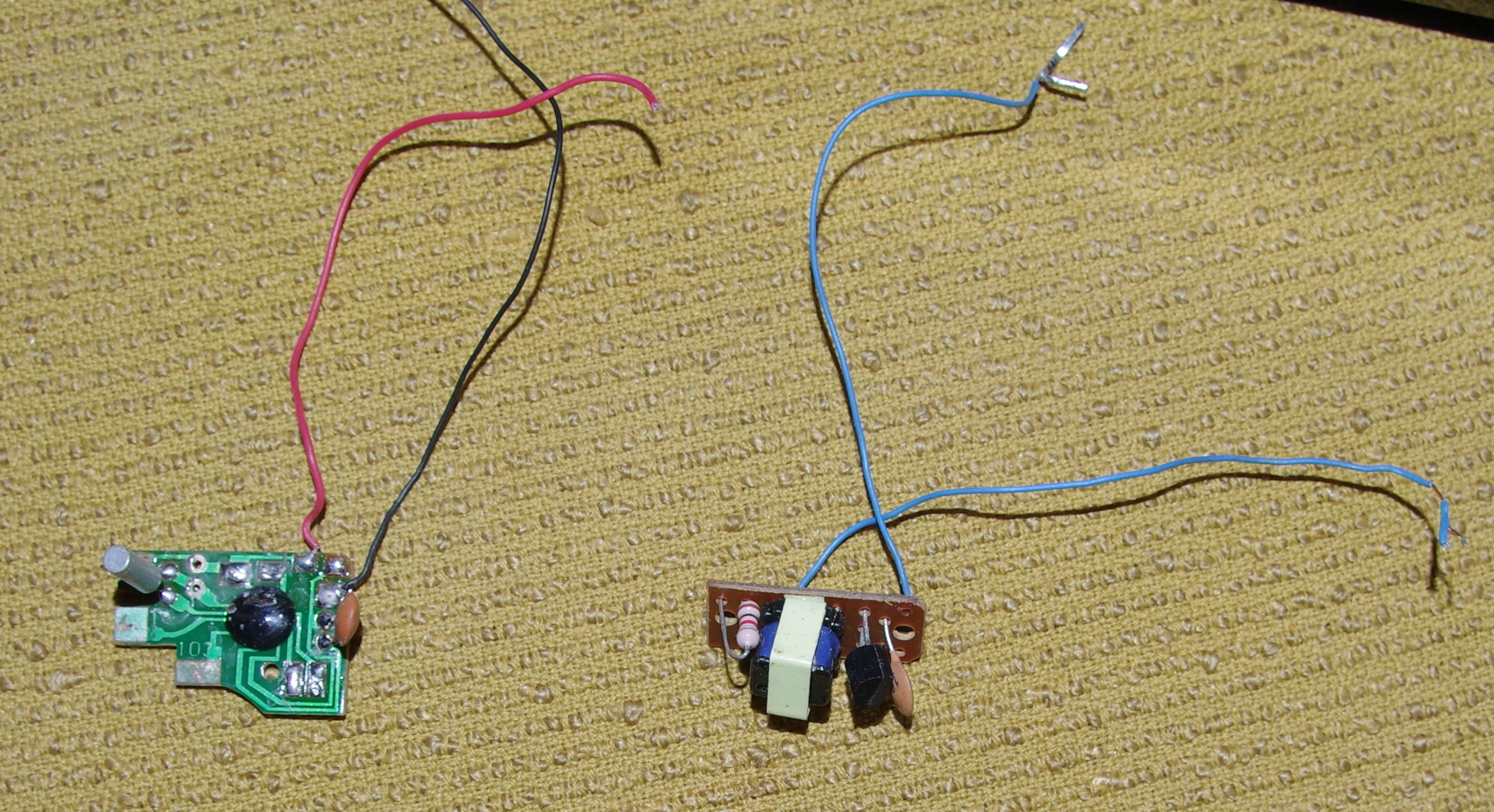 Ale vedle toho strojku byla ještě malá destička s transformátorkem, tranzistorem a odporem a z té vedly dva dráty do tohohle kolečka.