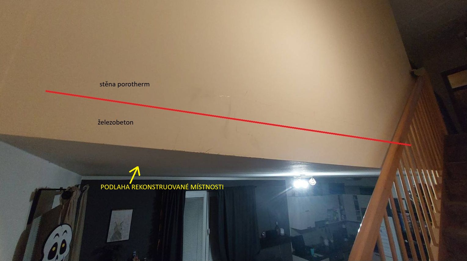 Odhlučnil jsem v patře ložnici akustickým SDK (předstěnami) o celkové váze cca 800kg rovnoměrně rozmístěnými podél stěn. Už před nějakou dobou jsem si začal všímat drobných prasklin na jedné z obkládaných stěn - z druhé strany (viz foto, červená čára znázorňuje linii prasklin). Na této straně totiž strop neobsahuje žádný nosný prvek, jsou tam schody. Prasklina je přesně v místě spoje stropu (tedy podlahy odhlučňované místnosti), což je 18cm tlustý železobeton. Dá se to snadno poznat poklepem, stěna nad čarou je totiž postavená z porothermu a pěkně duní. A tuto zeď jsem právě (mimo další 3) osadil SDK předstěnou.