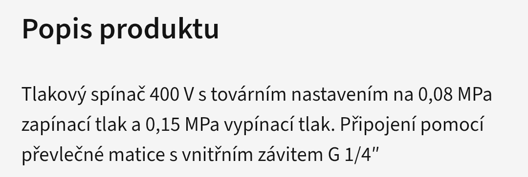 Bohužel, když si najdu parametry toho tlakového spínače, tak se píše, že 0,08 MPa je spínací tlak a… nový