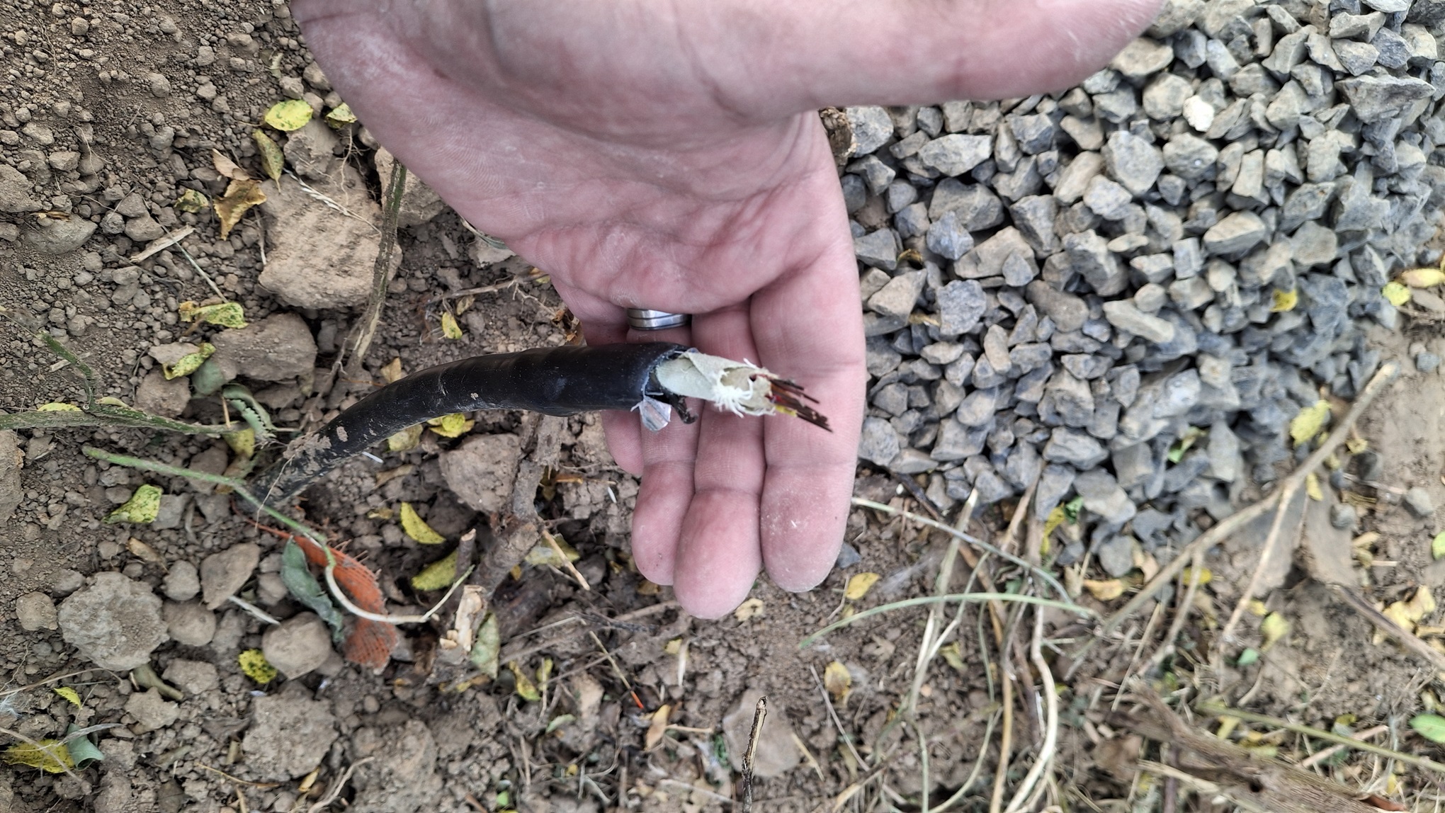 Kabel není uložen v chráničce, pouze označený oranžovou síťovinou. Kabel má přibližně 8 žil o průřezu cca 0,2 mm2, různobarevně označených. Nutno říct, že nebyl nijak hluboko uložen, pouze pár desítek centimetrů pod terénem.