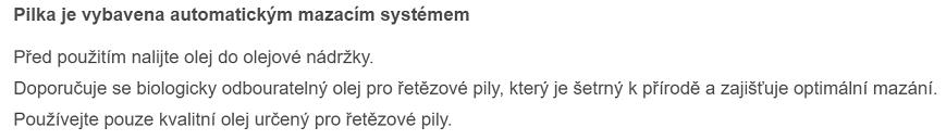 Koukal jsem se po internetu, nějaké návody tam jsou, ale zatím jsem nenašel rady ohledně oleje - u pilek jiných značek to víčko, kam se ten olej snad má lejt mnohdy chybí.