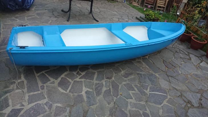 Loďka je z laminátu, teď je na ní modrá barva, zdá se, že původní.