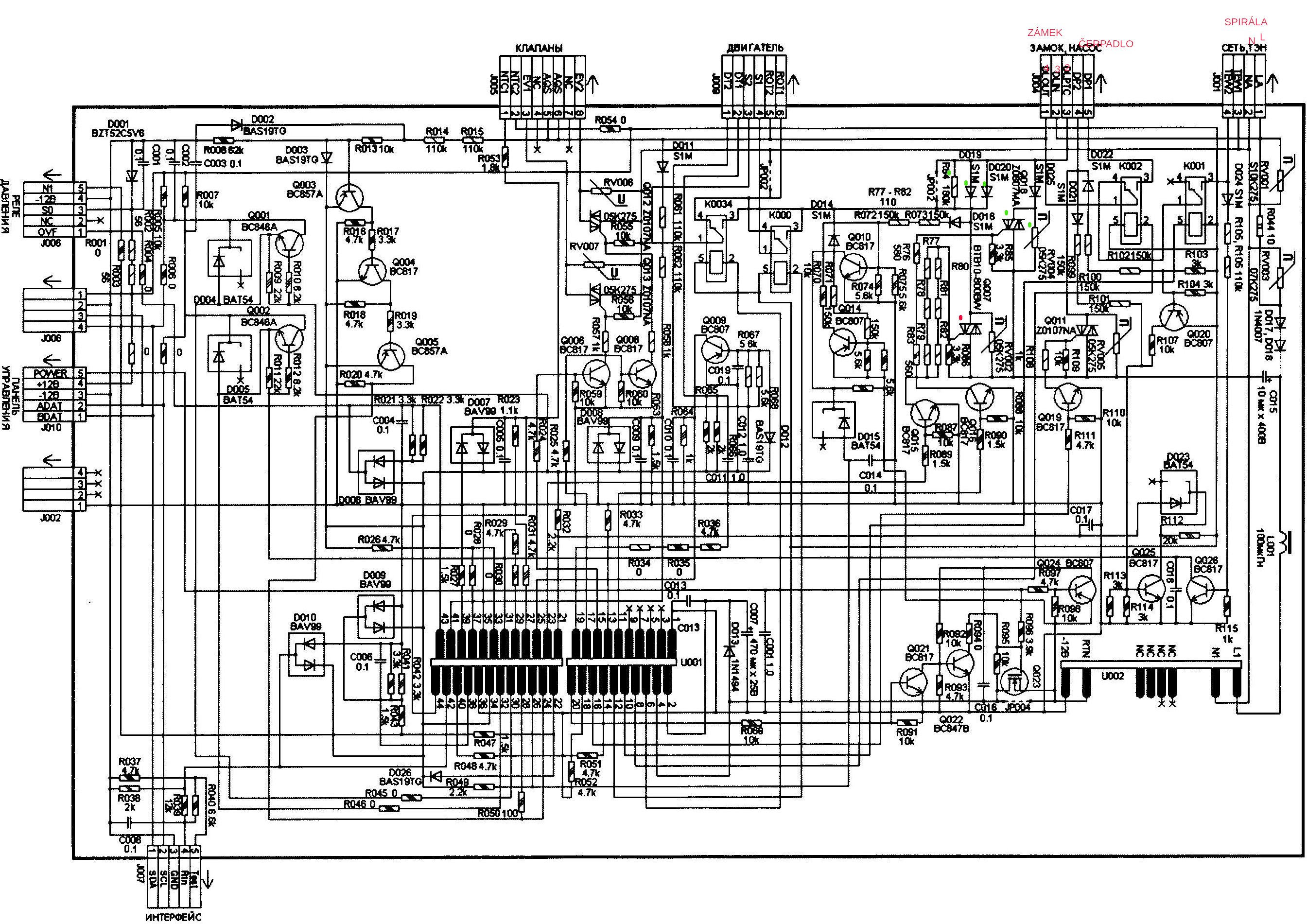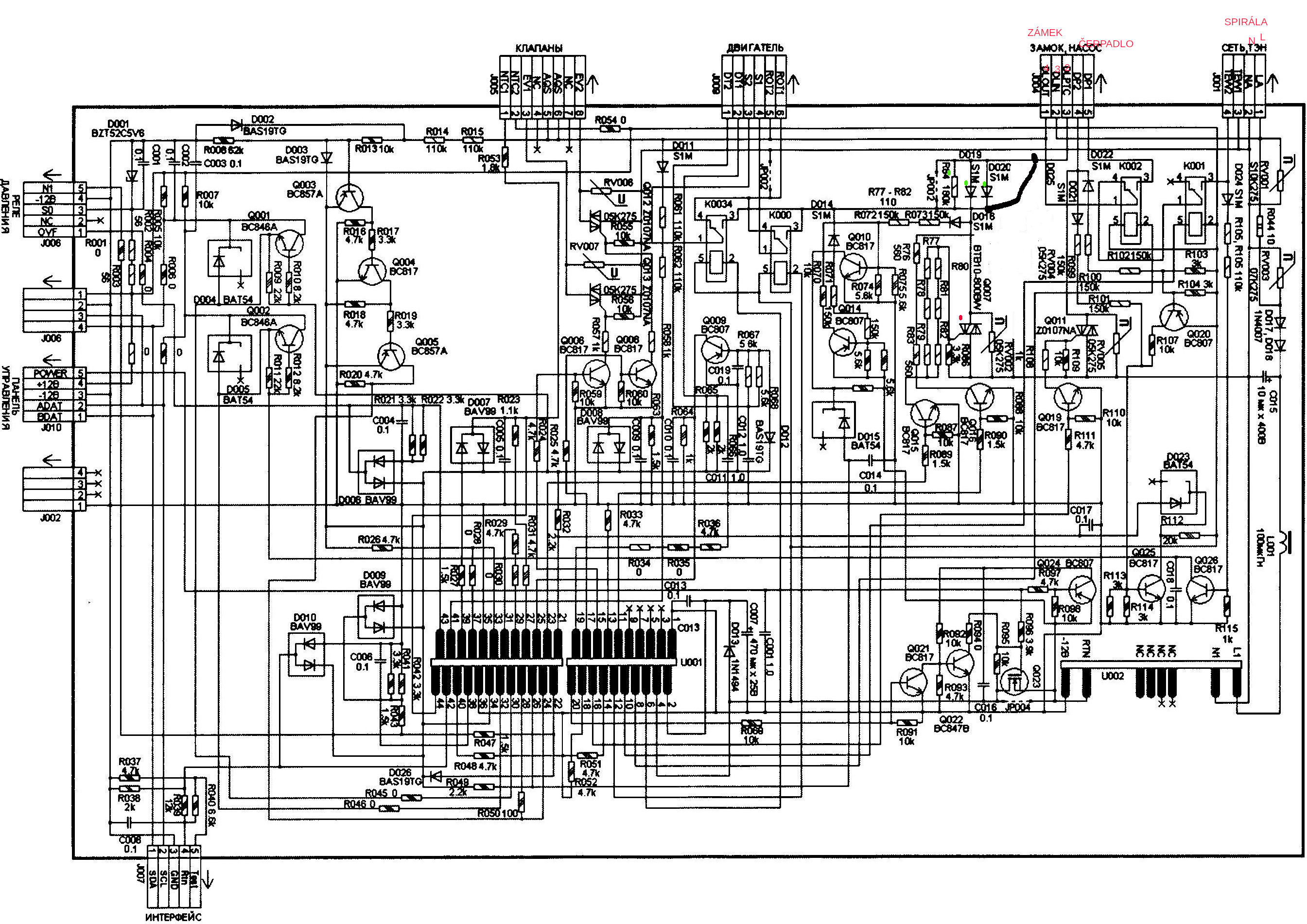 Našel jsem schéma zapojení ŘJ. Je sice z trochu jiného modulu, ale až na 5 součástek, které jsou ve schématu navíc, a které jsem označil zeleně, je stejné jako z moji pračky.